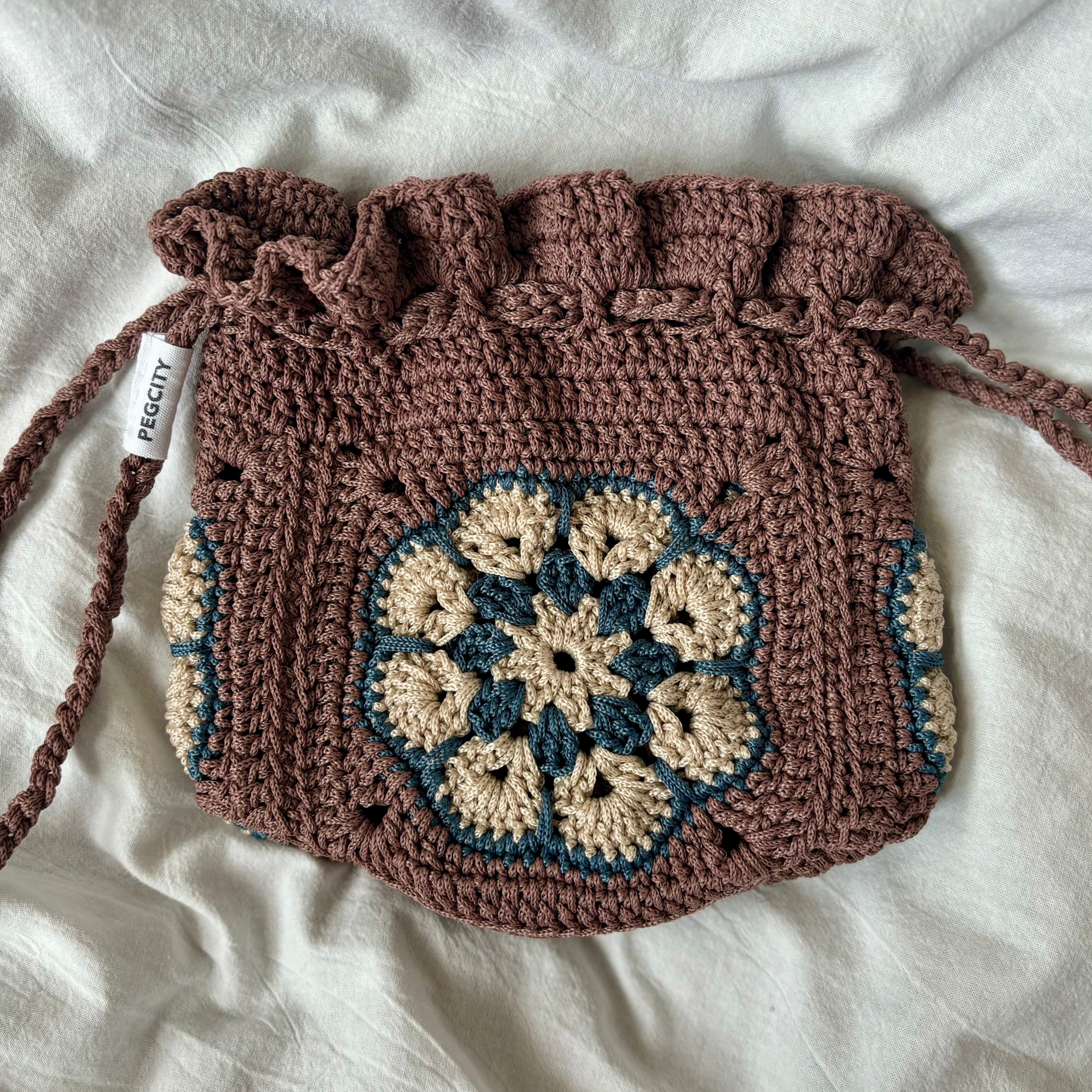 ころんとした形が可愛い、手編みの丸底巾着バッグ。