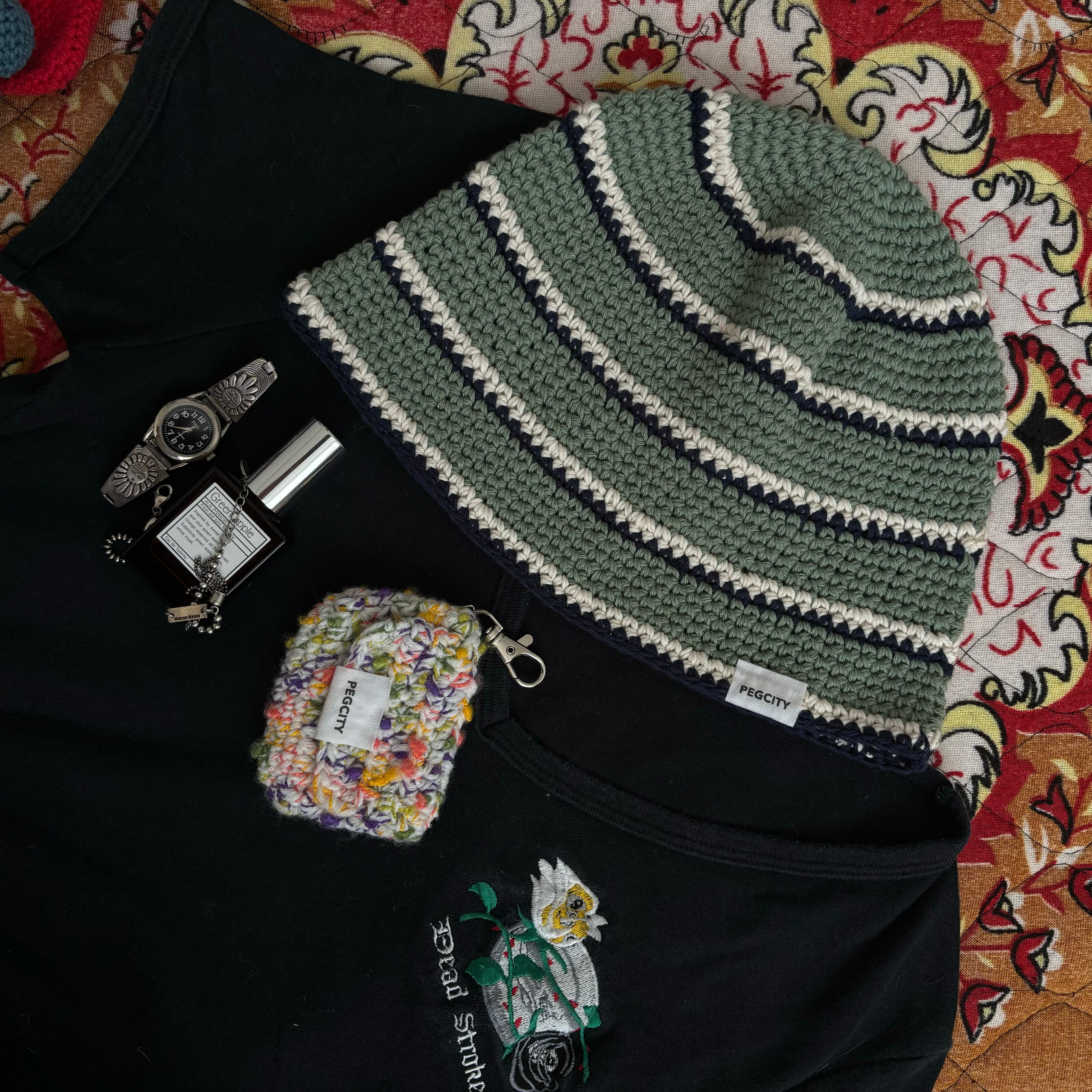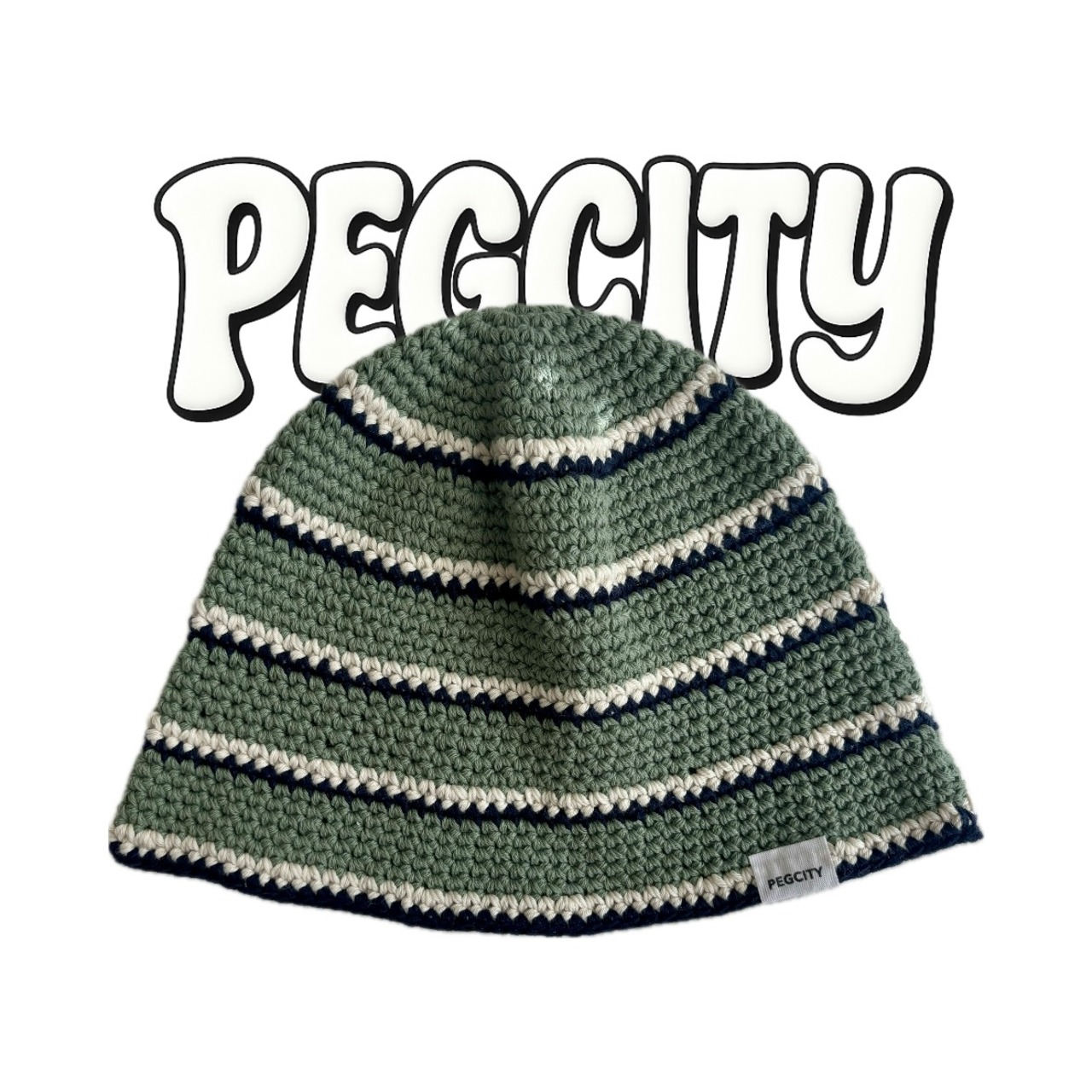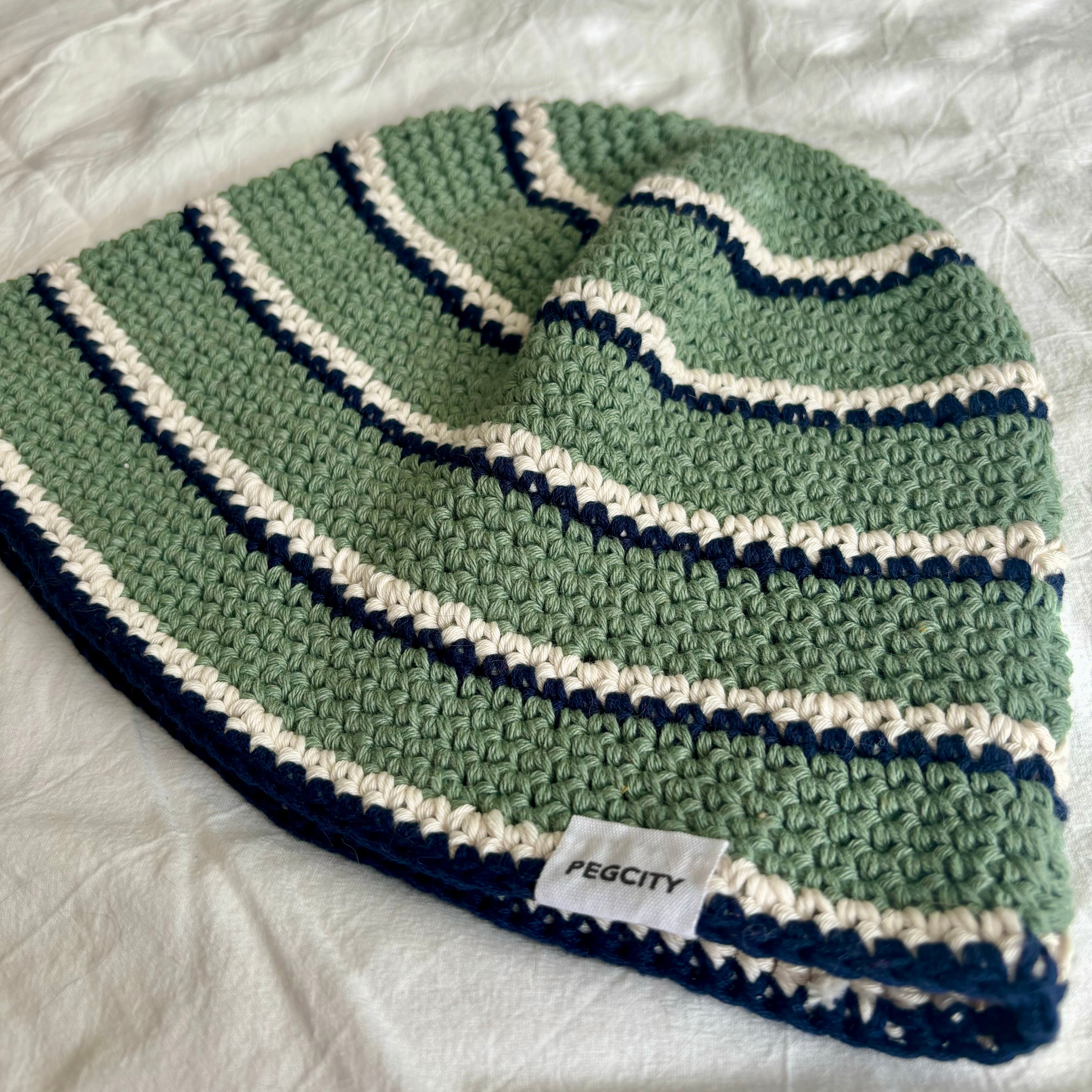 くすみグリーンに、ネイビー&オフホワイトのラインを効かせた手編みのクラッシャーハット。