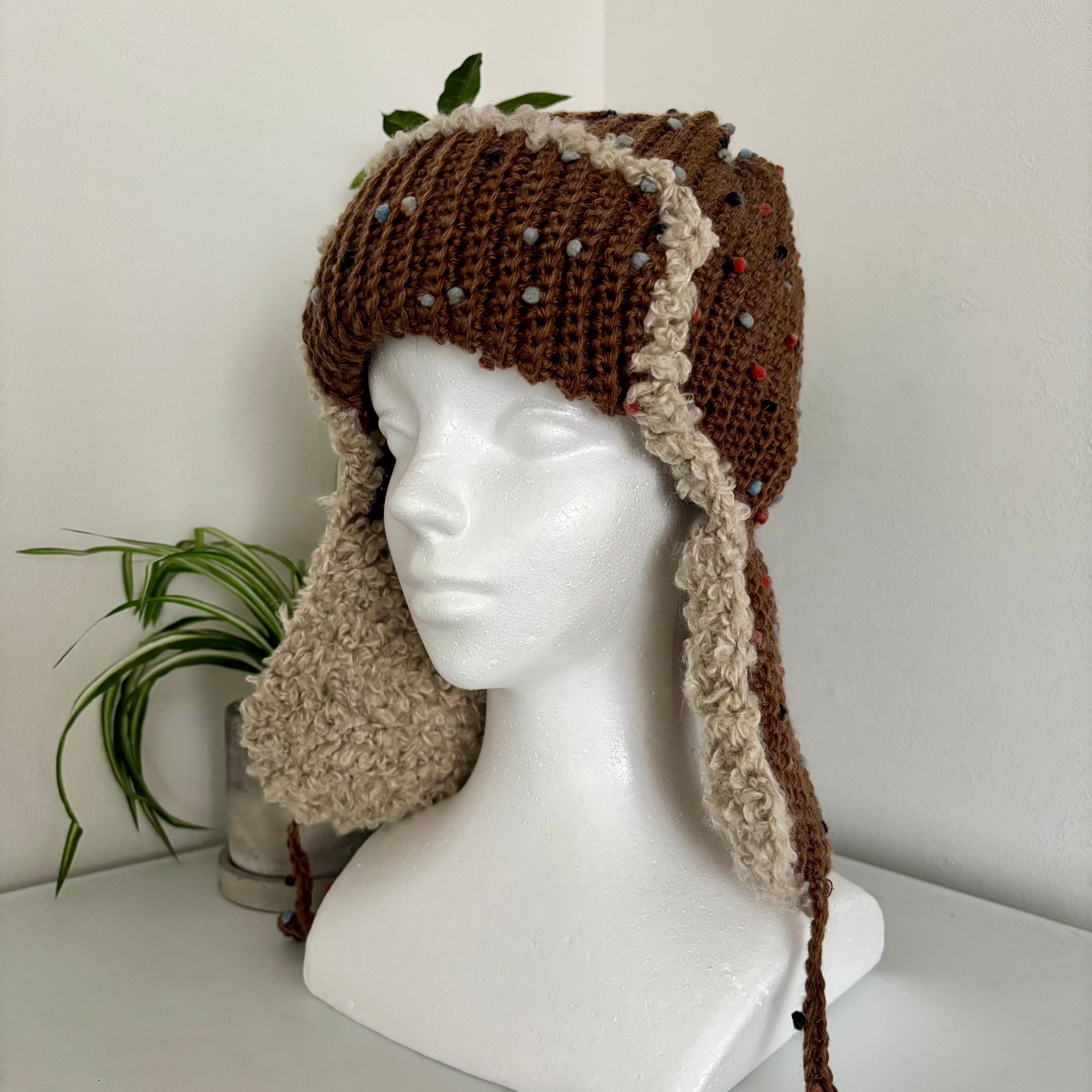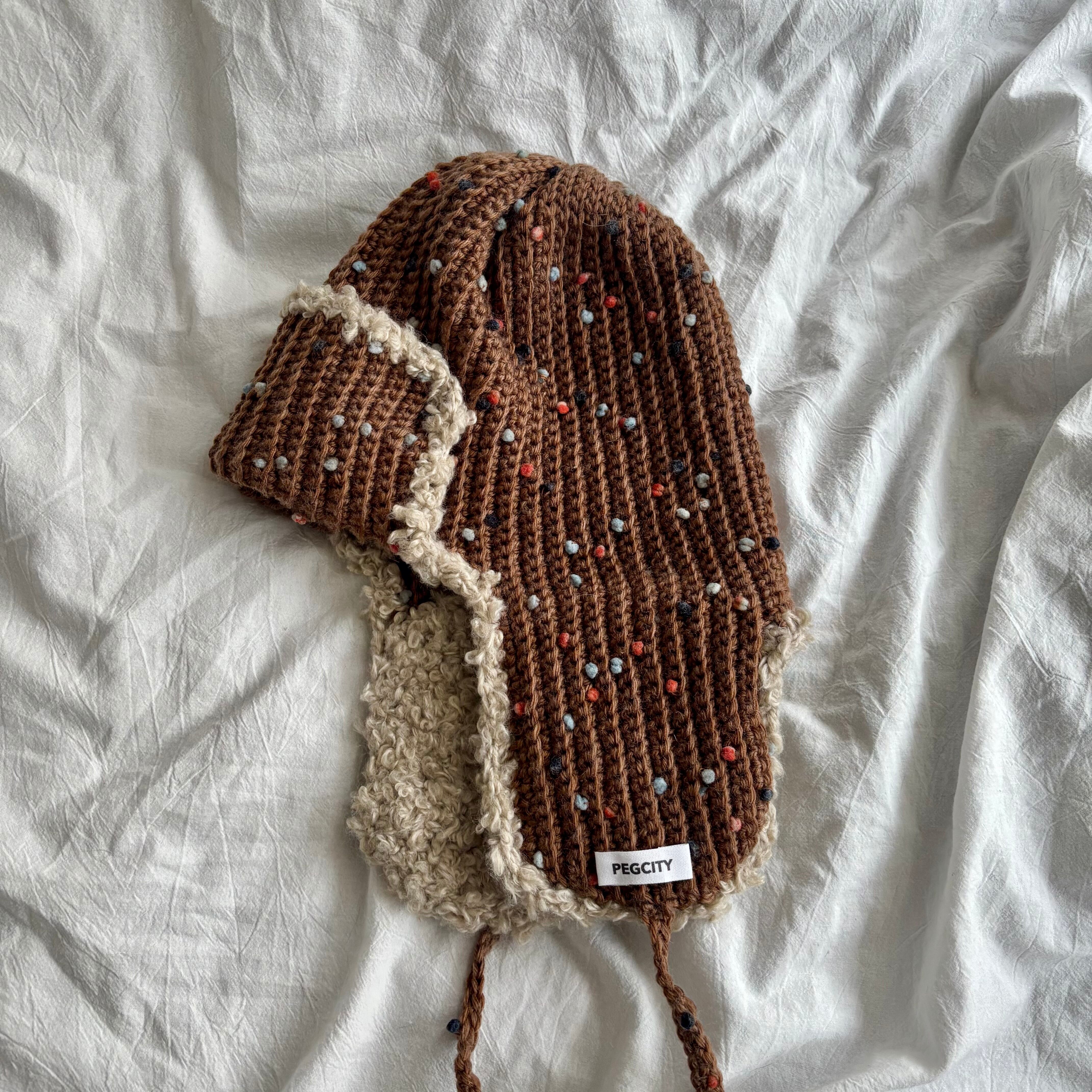 耳当て部分には、モコモコ糸を使用して暖かさアップ。