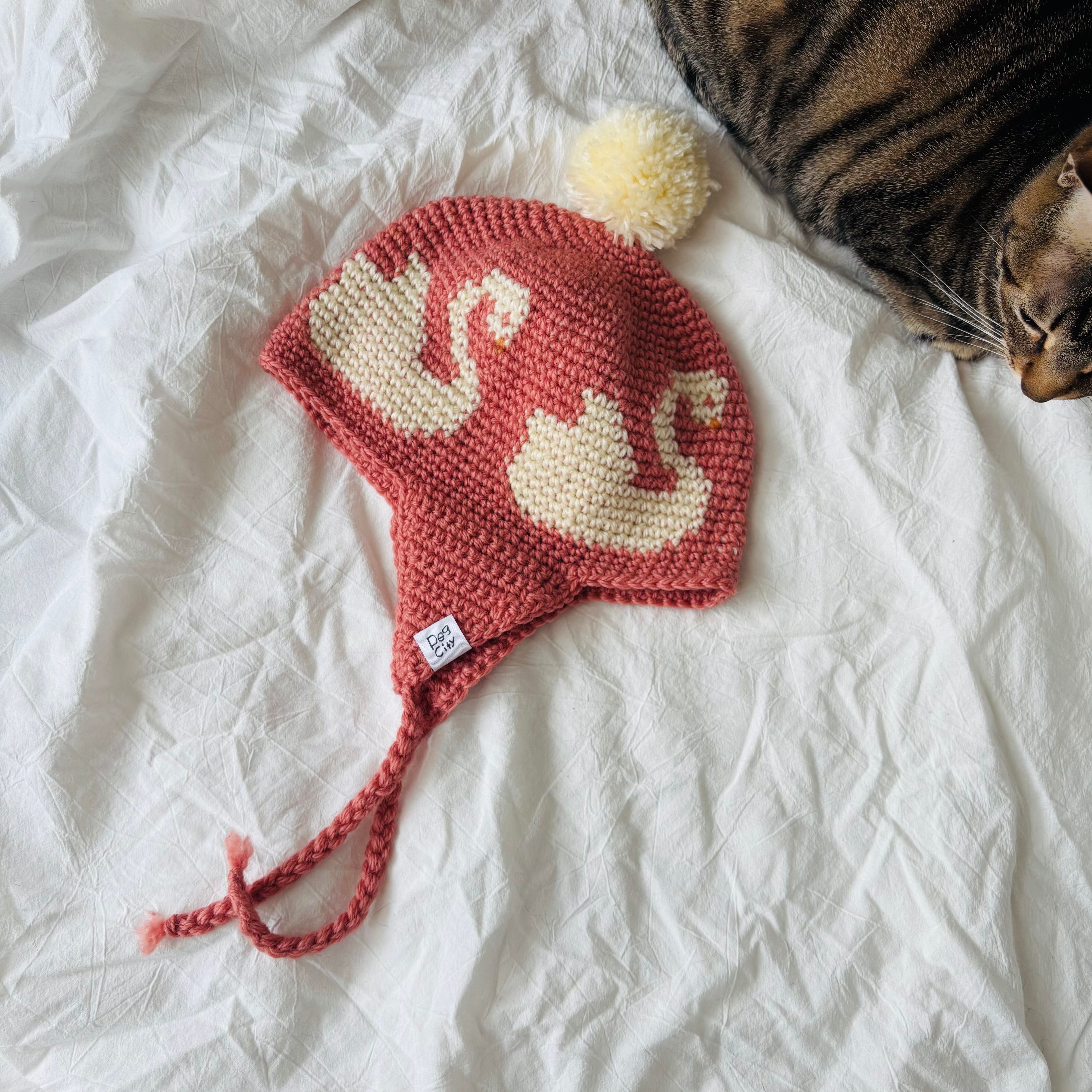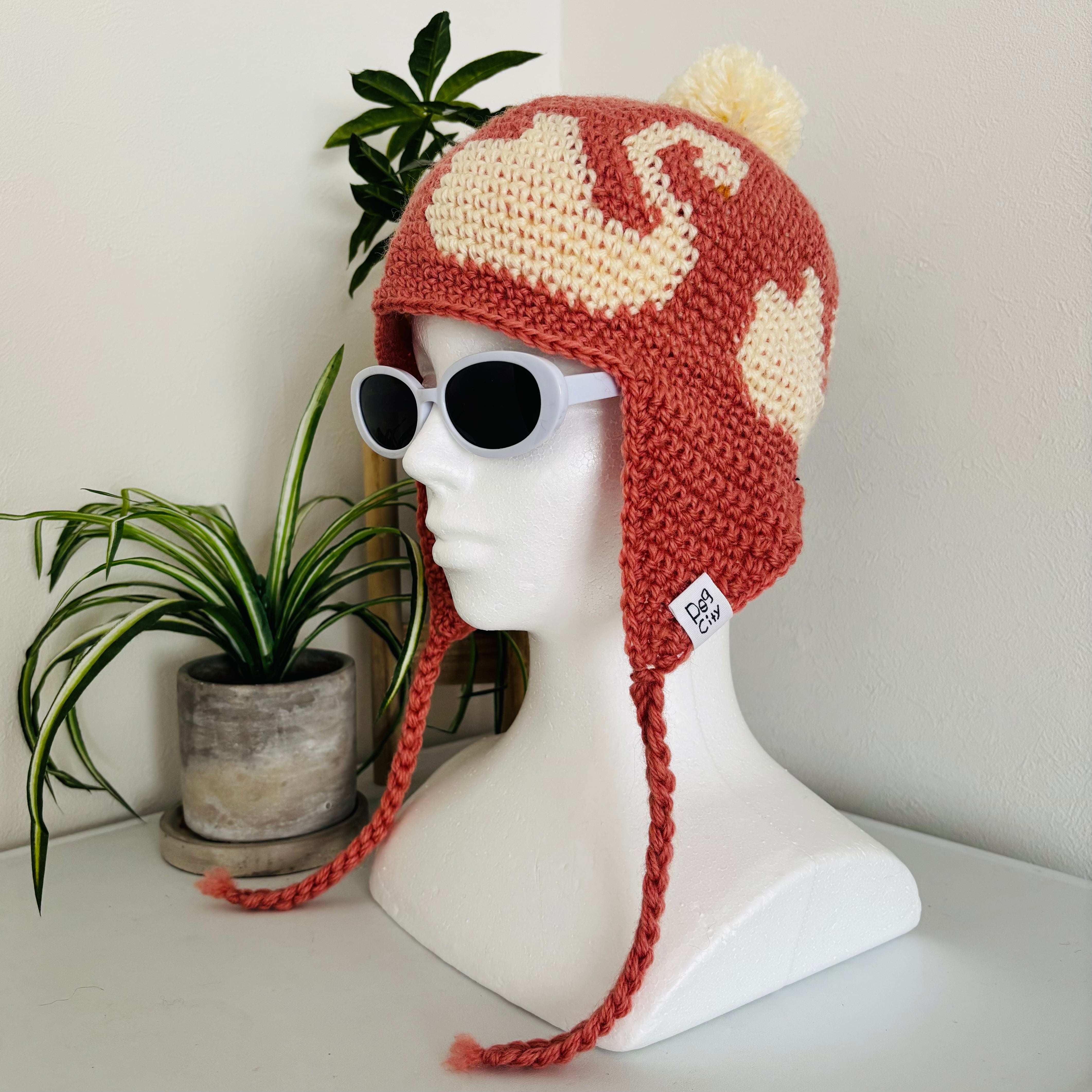 子供の頃に被っていたような、耳当て付きニット帽。